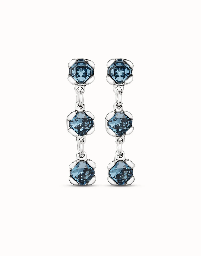 Long sterling silver-plated earrings with 3 faceted blue crystals. This jewel has been handmade in Spain.