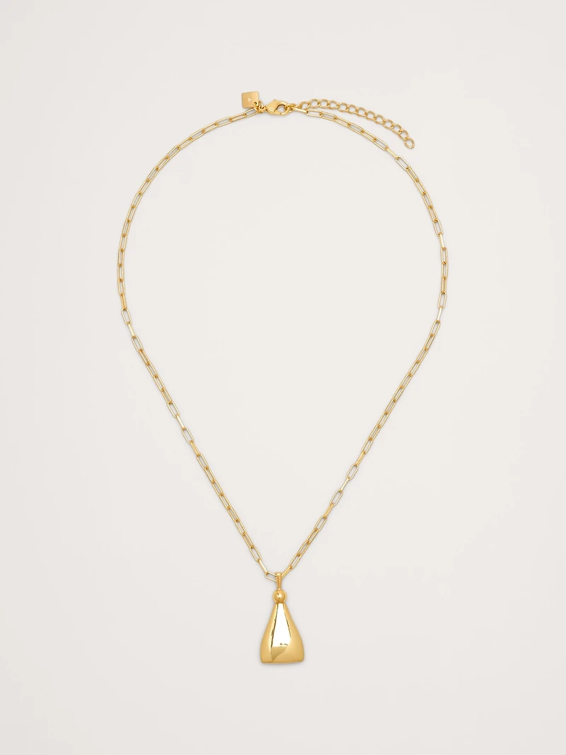 A modern take on perfume-bottle pendants, this one mimics the shape in your choice of 14k-gold or 999-silver plated brass. 14k-gold or 999-silver plated brass. Lobster clasp. Length: 18" with 2" extender.
