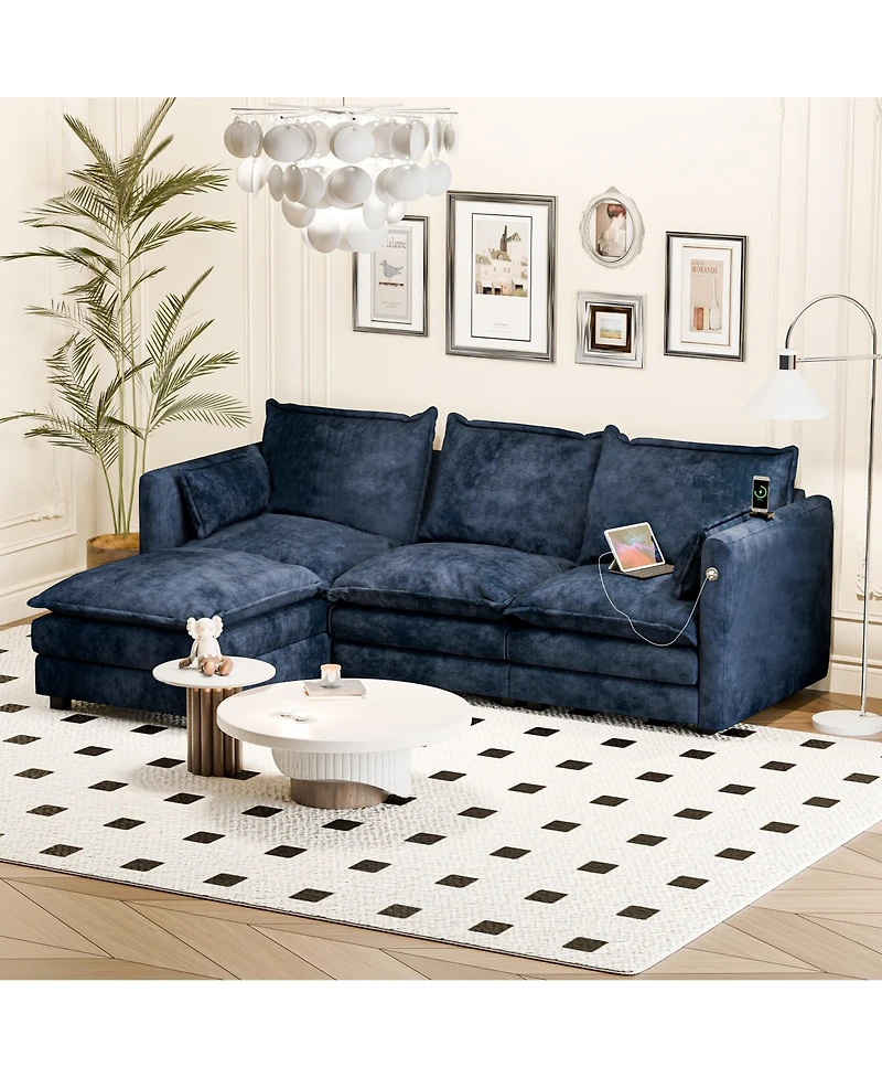 This sectional sofa is perfect for both lively gatherings and quiet family moments, elevating your living space with its stylish design. Upholstered in chenille fabric, the sofa offers a soft, skin-friendly touch and comfortable feel. The solid and engineered wood and metal frame ensures a reliable foundation, while the foam-filled cushions provide a cozy spot for relaxing on game nights, comfortably seating four. Built-in Usb and Type-c charging ports make it easier than ever to keep your devices powered up. The sectional couch comes with movable ottoman, perfect for propping up your feet or placing a tray of snacks. Ideal for any living room, family room, game room, office, or apartment.