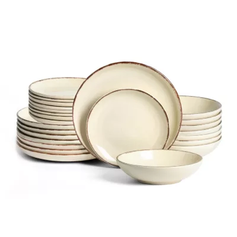 From savory breakfasts to hearty dinners, the Earth & Clay Heath Stoneware 24-Piece Dinnerware Set brings a beautiful cohesive look with it to every meal. You and your guests will appreciate its glossy earthy beige finish, along with each piece's clean coupe shape, subtle speckles, and delicate hand-painted rims. With a tasteful dramatic appeal, there's truly nothing about this set that won't go unnoticed. This set includes: 8 10.6" dinner plates, 8 8.25" salad plates, 8 8.25" bowls.