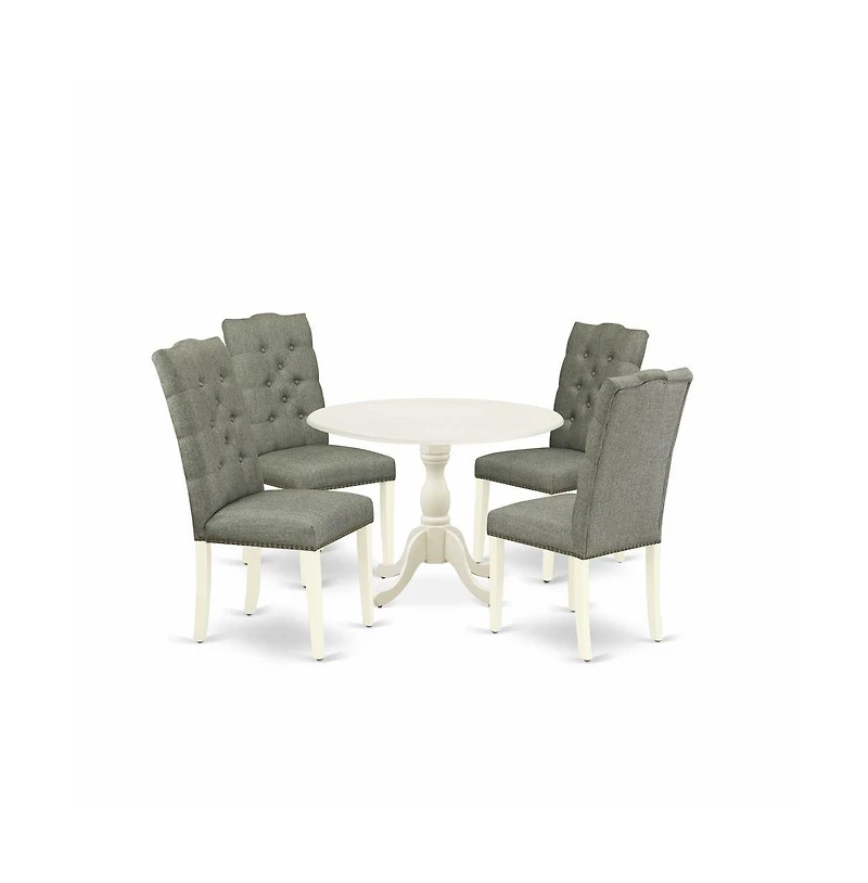East West Furniture DMEL5-lwh-07 5 Piece Dining Table Set Includes 1 Drop Leaves Wooden Table and 4 Smoke Linen Fabric Dining Room Chairs Button Tufted Back with Nail heads - Linen White Finish. 5-pc Kitchen Table Set: This 5-Piece modern dining table set includes 1 Drop Leaves dining room table and 4 parsons chairs will add a classic appearance to any home. These versatile pieces feature a classic design that can be incorporated effortlessl