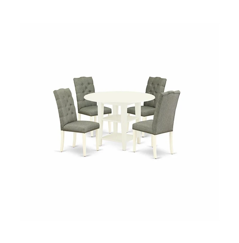 Dining Room Set Linen White, SUEL5-lwh-07. Our dinette set includes 4 of the stylish upholstered dining chairs. upholstered dining chairs have a style fit for royalty. Its parson dining chairs are upholstered in your option of color properly accented with button tufting. This standard 4 parso. The parson dining chair's seat and back are padded and button tufted. The durable wooden legs are finished in Linen White color to match the design