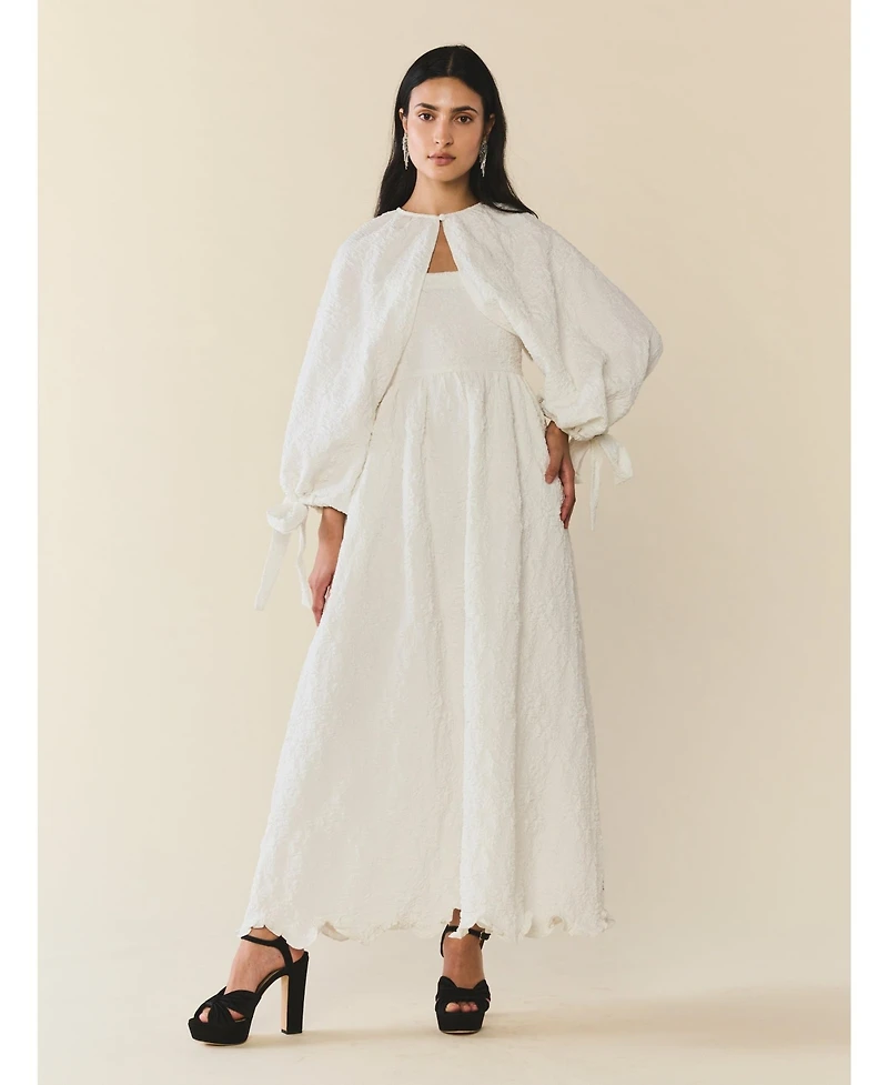 An effortless layer made for movement, softness, and ceremony-adjacent moments. This airy bridal cape features voluminous balloon sleeves with delicate tie cuffs and a romantic button closure. Designed to drape lightly over your shoulders, it adds quiet drama without overwhelming the look. Crafted in a textured floral quilted fabric inspired by vintage Parisian textiles Becca discovered at Marche aux Puces de Saint-Ouen, it feels both heirloom and modern, history, texture, and intuition stitched into something new. Wear it for your welcome party, civil ceremony, outdoor cocktail hour, or for softly covered shoulders in church. A finishing layer for brides who like their romance wearable.