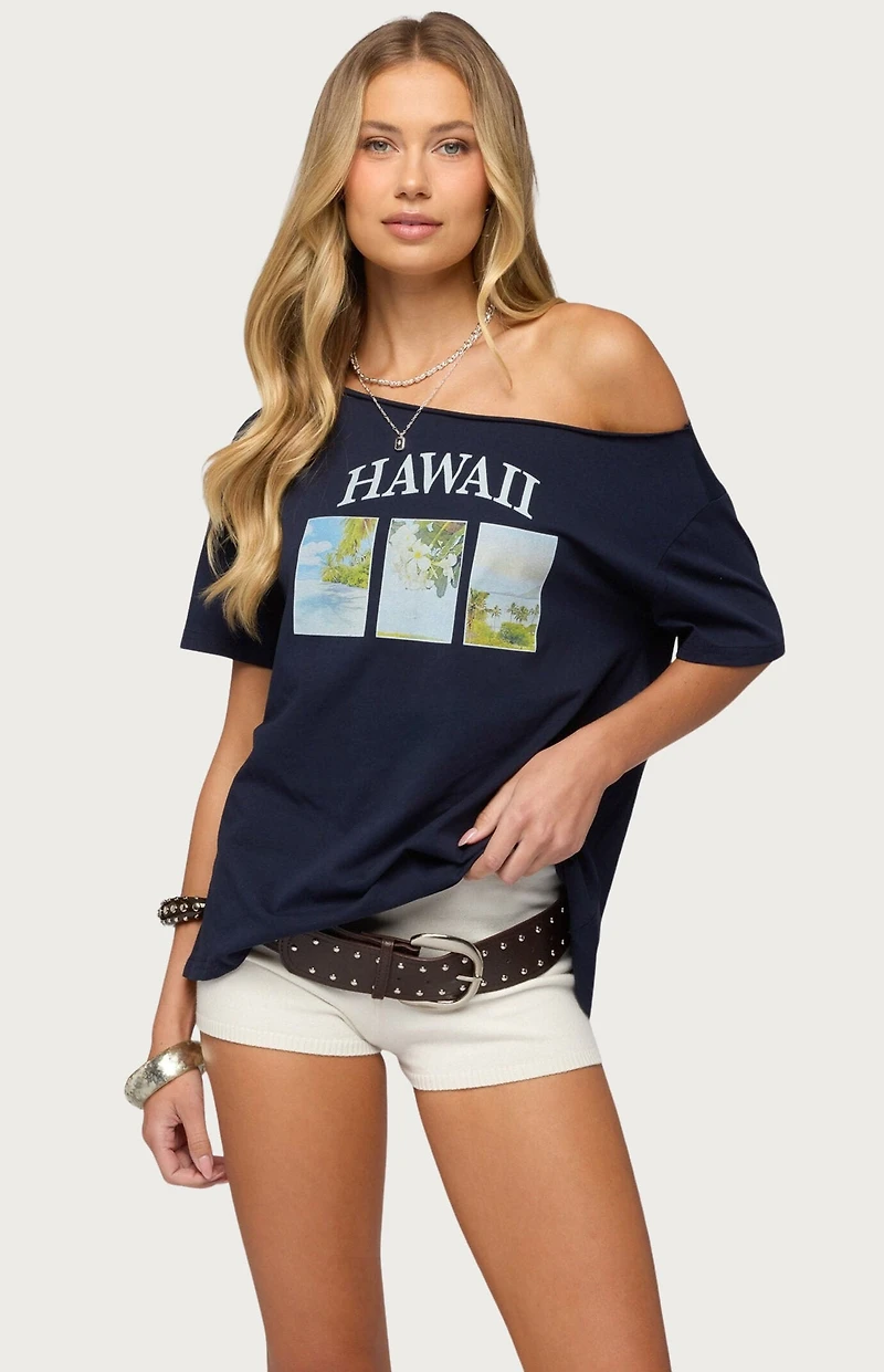 This comfortable Hawaiian Babe Off Shoulder T-Shirt from Edikted will have you looking your best wherever you go. With its perfect fit and cute graphic print, everyone will be asking where they can score it too.