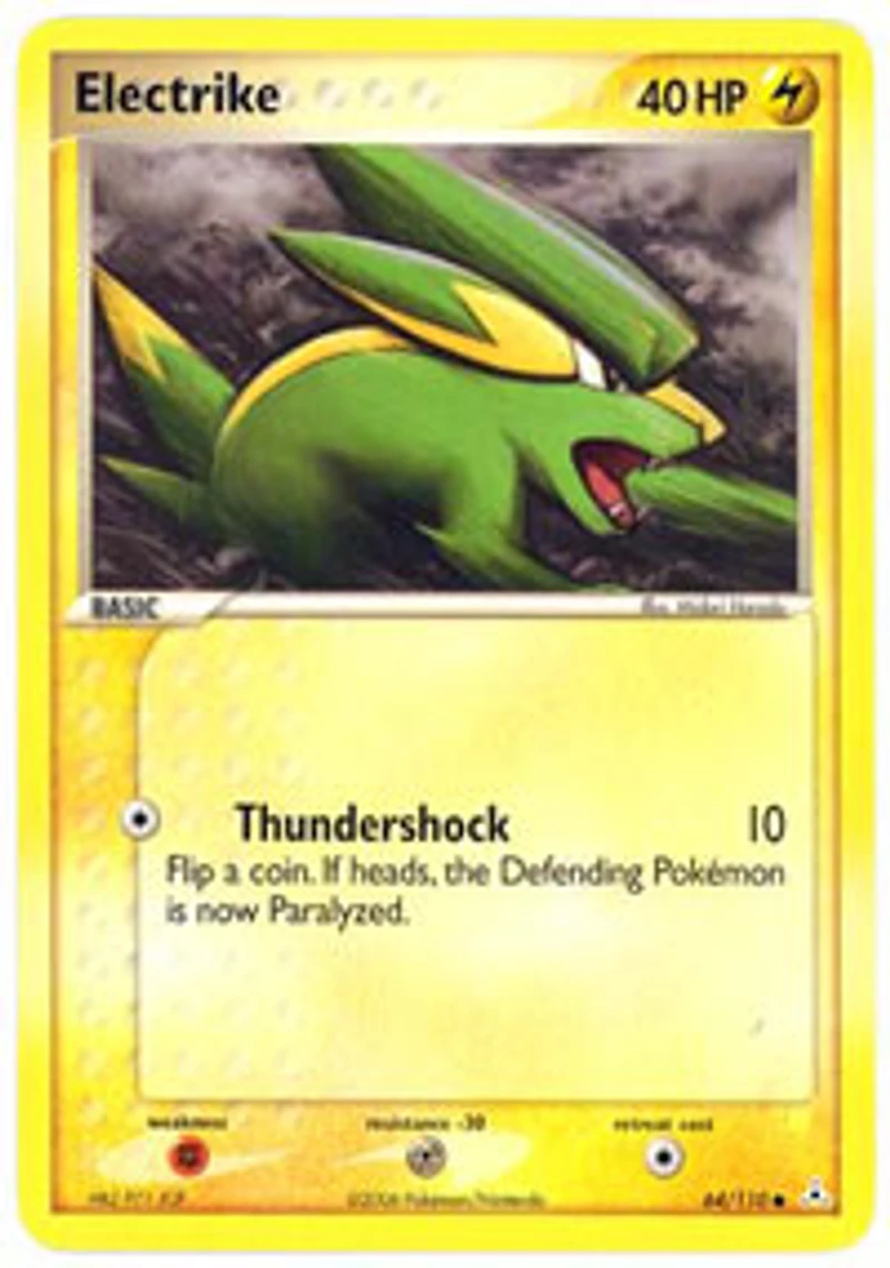 Set: EX Holon Phantoms Card Number: 64 Rarity: Common Illustrator: Midori Harada Retreat Cost: 1 Weakness: HP: 40 Stage: Basic Card Type: Lightning Resistance: Name: Electrike Finish: Regular Attack #1: 1 Thundershock (10) Flip a coin. If heads , the Defending Pok Manufacturer: The Pokemon Company