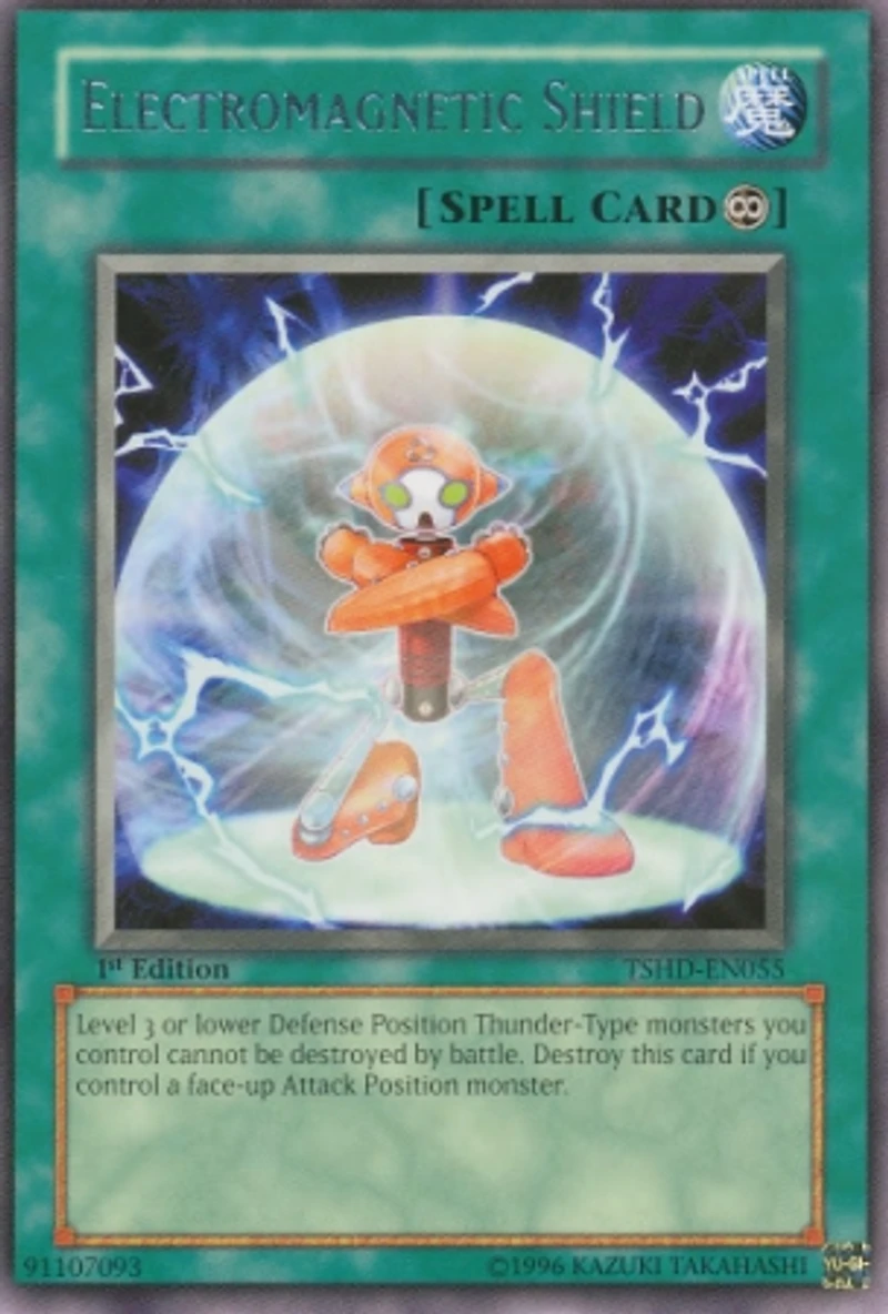 Card Rules: No rulings available for this card. Passcode: 91107093 Set: Shining Darkness Card Number: TSHD-EN055 Rarity: Rare Attribute: Spell Card Text: Level 3 or lower face-up Defense Position Thunder-Type monsters you control cannot be destroyed by battle. Destroy this card if you control a face-up Attack Position monster. Card Type: Continuous Spell Name: Electromagnetic Shield Edition: Unlimited