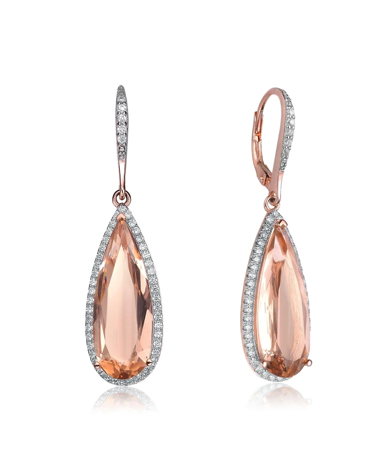 Add some glamour and sophistication to any outfit with these gorgeous lever back earrings with tear drop colored cubic zirconia. The earrings have a glamorous design that creates a beautiful contrast and elegance. The large colored cubic zirconia in a tear drop shape shines with a lovely hue that catches the eye. The colored cubic zirconia is encircled by small clear cubic zirconia in a pave setting, adding more sparkle and charm. These earrings are a stunning accessory for any occasion. These earrings are available in two tone: White Gold Plating and 18K Rose Gold Plating with options for purple, blue, green, red or pink cubic zirconia, or White Gold Plating and 14K Gold Plating with pink cubic zirconia.
