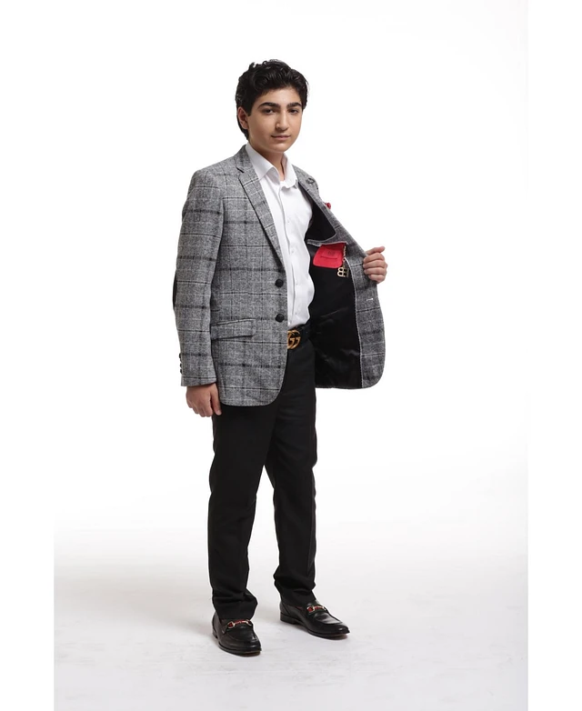 Elie Balleh Boys Grey Slim Fit Plaid Blazer