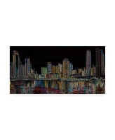 This ready to hang, gallery-wrapped art piece features a colorful line art cityscape filling a black background. Gallery-wrap is a method of wrapping an artist's canvas around a hidden, wooden frame allowing for a frameless presentation.