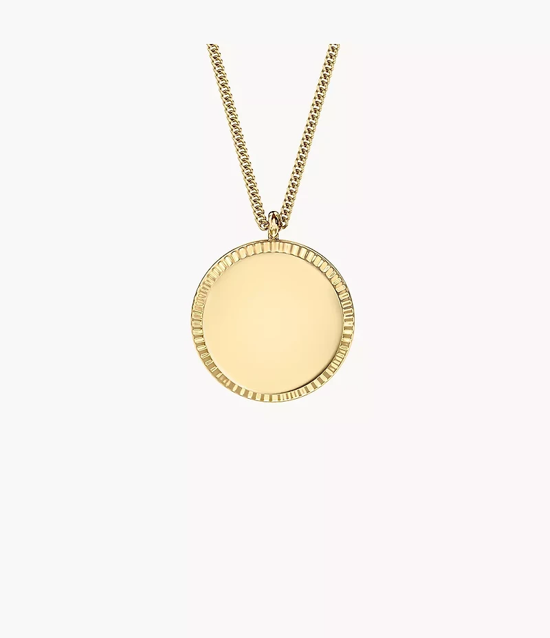 Crafted in polished gold-tone stainless steel, this pendant necklace features a sleek, engravable disc suspended from a delicate chain. Textured details along the edge add subtle contrast, while a lobster clasp ensures secure, effortless wear.
