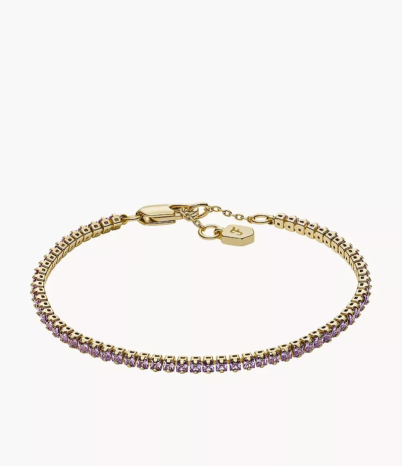 This polished gold-tone tennis chain bracelet features pavé crystal accents in a rich amethyst color that add shimmer to this timeless design. A lobster clasp closure ensures a secure fit and complements the classic silhouette.