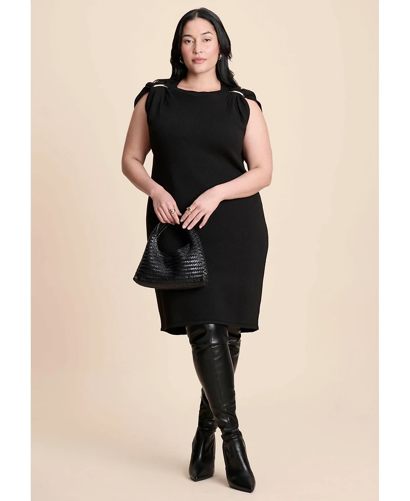 Add subtle edge to your Lbd lineup with this sleeveless sweater dress accented by metallic hardware at the shoulders. A close fit and sleek knit make it an instant statement piece.55% Polyester 35% Acrylic 10% Polyamide. Close fit. Unlined. Pull on. Sleeveless. Shoulder hardware detail41" from highest point of shoulder on size 18/20Mid stretch knit jersey. Machine wash cold gentle cycle with like colors. Only non-chlorine bleach when needed. Do not tumble dry. Lay flat to dry. Cool iron as needed.