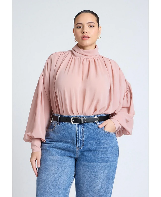 Eloquii Women's Shirred Mockneck Top With Sheer Sleeve