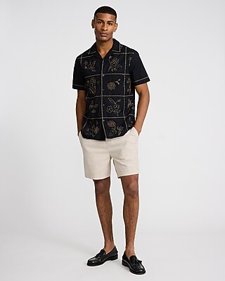 This breathable cotton shirt features short sleeves, a camp collar, a button down front, and an embroidered tile design.