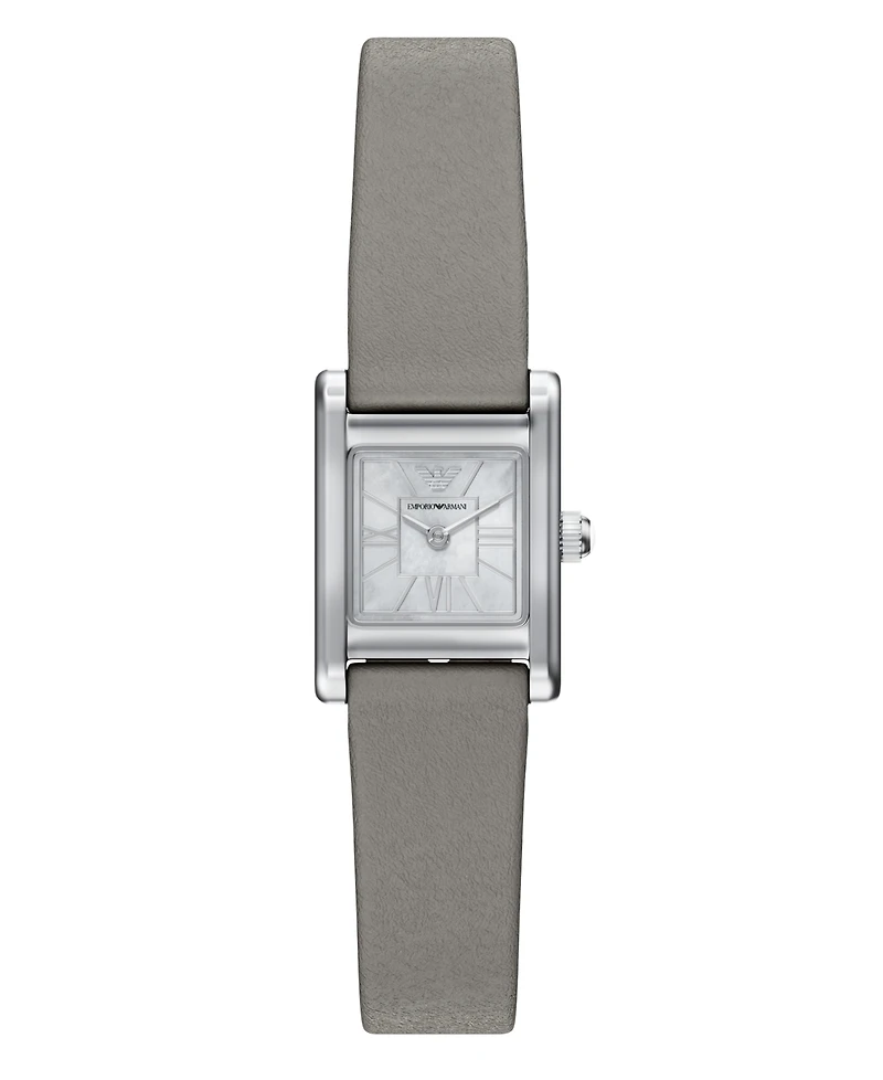 Emporio Armani's 19mm x 26mm watch showcases a glossy Mother-of-Pearl dial with silver Roman numeral indexes in a stainless steel case. The gray leather strap adds contrast for a refined look, making this two-hand dress watch sure to stand the test of time in your collection.