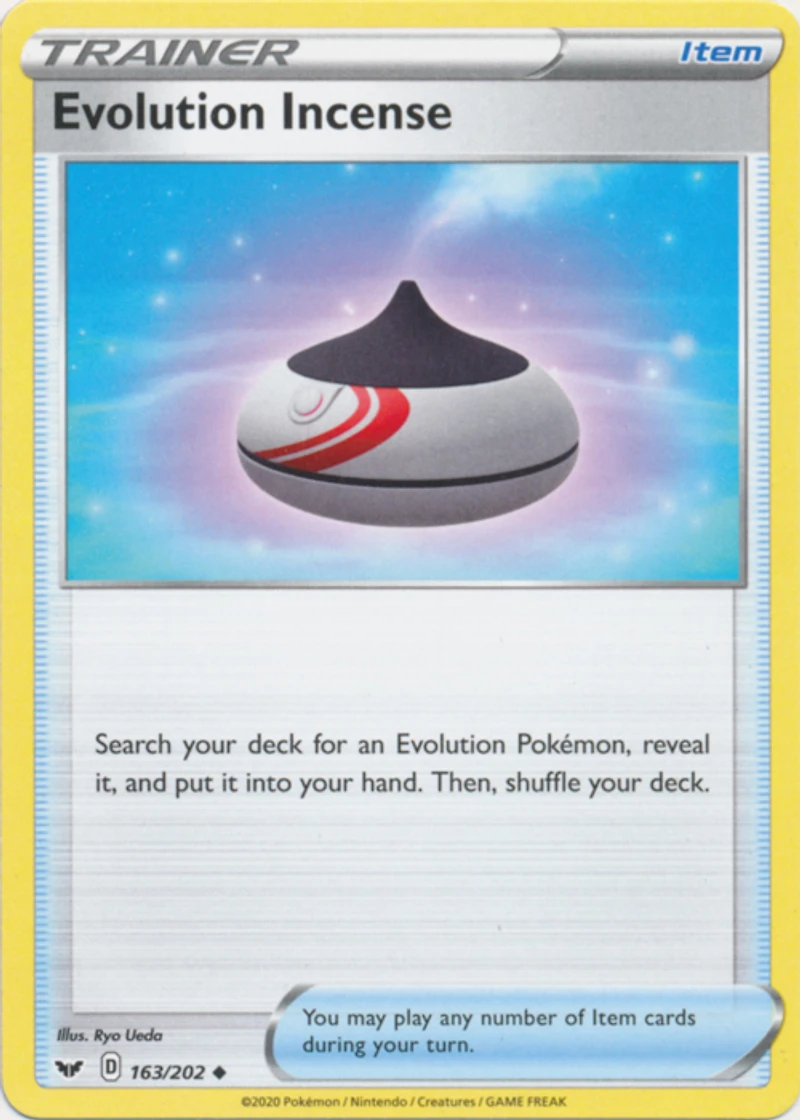 Set: Sword & Shield Base Set Card Number: 163/202 Rarity: Uncommon Card Type: Trainer - Item Name: Evolution Incense Finish: Regular Card Text: Choose an Evolution Pokemon from your deck reveal it and put it into your hand. Then shuffle your deck.