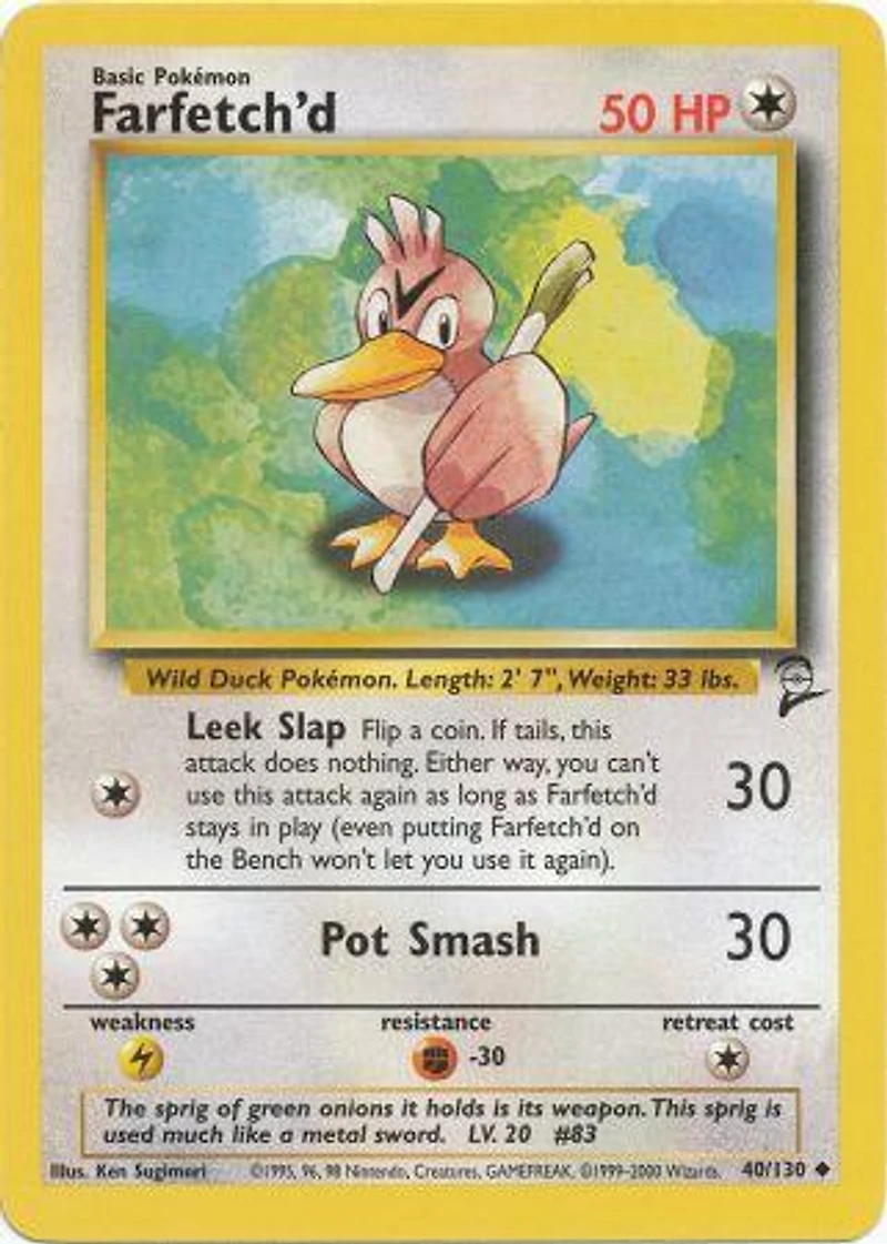 Set: Base Set 2 Card Number: 40/130 Rarity: Uncommon Illustrator: Ken Sugimori Retreat Cost: 1 Weakness: Lightning HP: 50 Stage: Basic Card Type: Colorless Resistance: Fighting Name: Farfetch'd Finish: Regular Attack #1: C Leek Slap (30) Flip a coin. If tails , this attack does nothing. Either way you can't use this attack again as long as Farfetch'd stays in play (even putting Farfetch'd on the Bench won't let you use it again). Attack #2: CCC Pot Smash (30) Edition: Unlimited Manufacturer: Wizards of the Coast