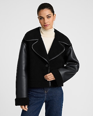 A faux leather and sherpa coat perfect to keep you warm and looking chic. This style has a one button closure and an oversized collar.