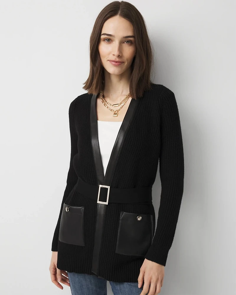 We love this cardigan for elevated everyday wear. Faux leather trim and patch pockets add stylish detail to this boyfriend cardigan. A belted waist adds shape to this easy-to-wear knit with a hint of cashmere. Wear it over jeans and tees.