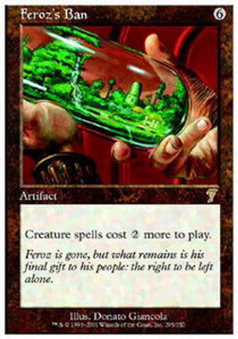 Color: Artifact Card Text: Creature spells cost 2 more to play. Rarity: R Cost: 6 Card Type: Artist: Donato Giancola Name: Feroz's Ban Finish: Regular Card Number: 295/350 Set Name: Seventh Edition