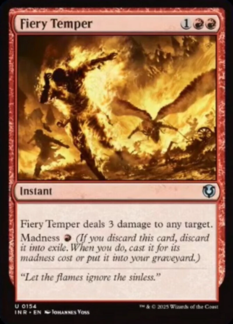 Color: Red Card Text: "Let the flames ignore the sinless." Rarity: U Cost: 1RR Card Type: Instant Artist: Johannes Voss Name: Fiery Temper Finish: Regular Card Number: 154 Set Name: Innistrad Remastered