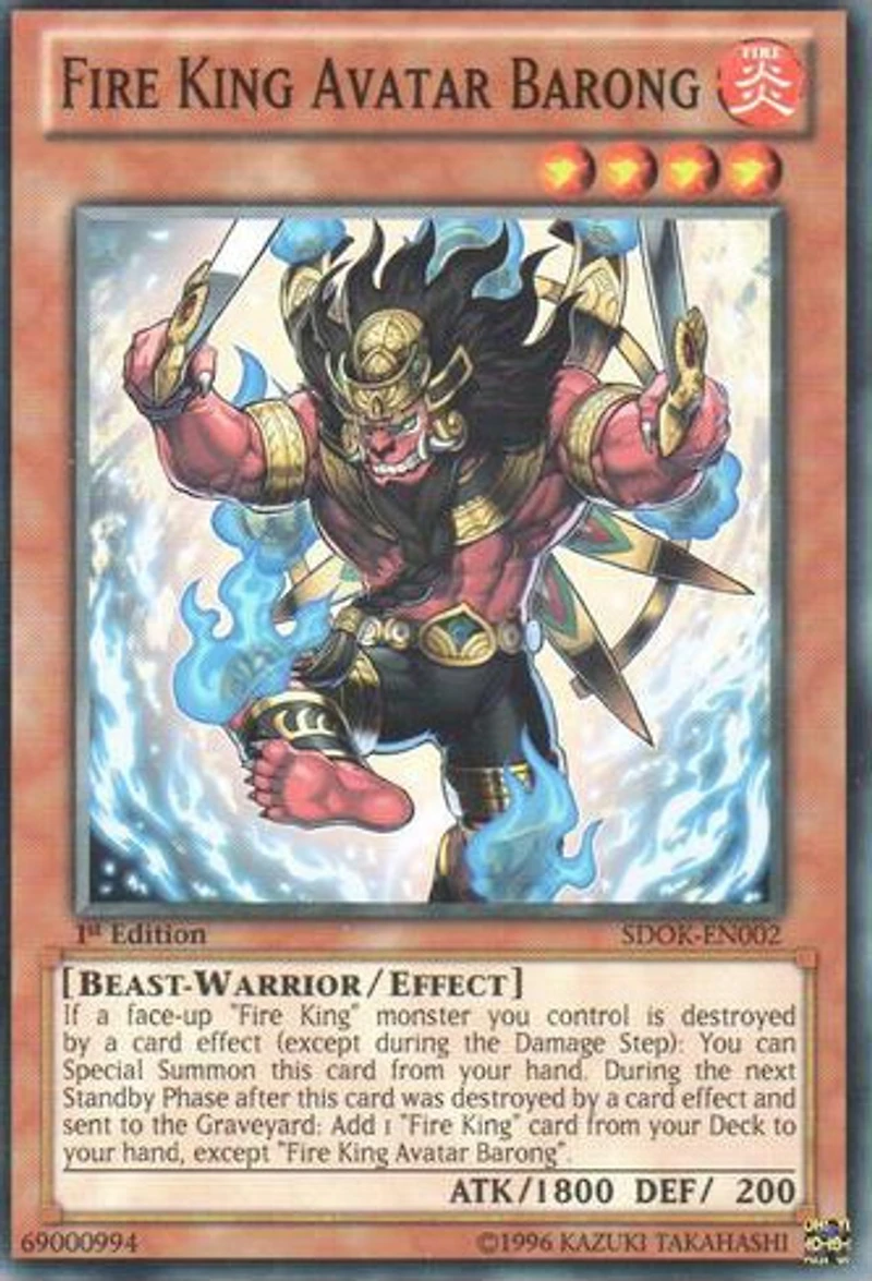 Passcode: 69000994 Set: Structure Deck: Onslaught of the Fire Kings ATK/DEF: 1800/200 Card Number: SDOK-EN002 Monster Type: Beast-Warrior Rarity: Common Attribute: Fire Card Text: If a face-up "Fire King" monster you control is destroyed by a card effect (except during the Damage Step): You can Special Summon this card from your hand. During the next Standby Phase after this card was destroyed by a card effect and sent to the Graveyard: Add 1 "Fire King" card from your Deck to your hand , except "Fire King Avatar Barong". Level: 4 Card Type: Effect Monster Name: Fire King Avatar Barong Edition: 1st