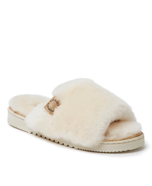 Fireside By Dearfoams Women's New Castle Genuine Shearling Cross Band Fuzzy Slide Slipper