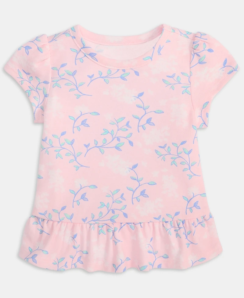 A sweet vintage-inspired look with a delicate floral print, this First Impressions T-shirt keeps her comfy in cotton-blend fabric finished with a flouncy peplum hem.