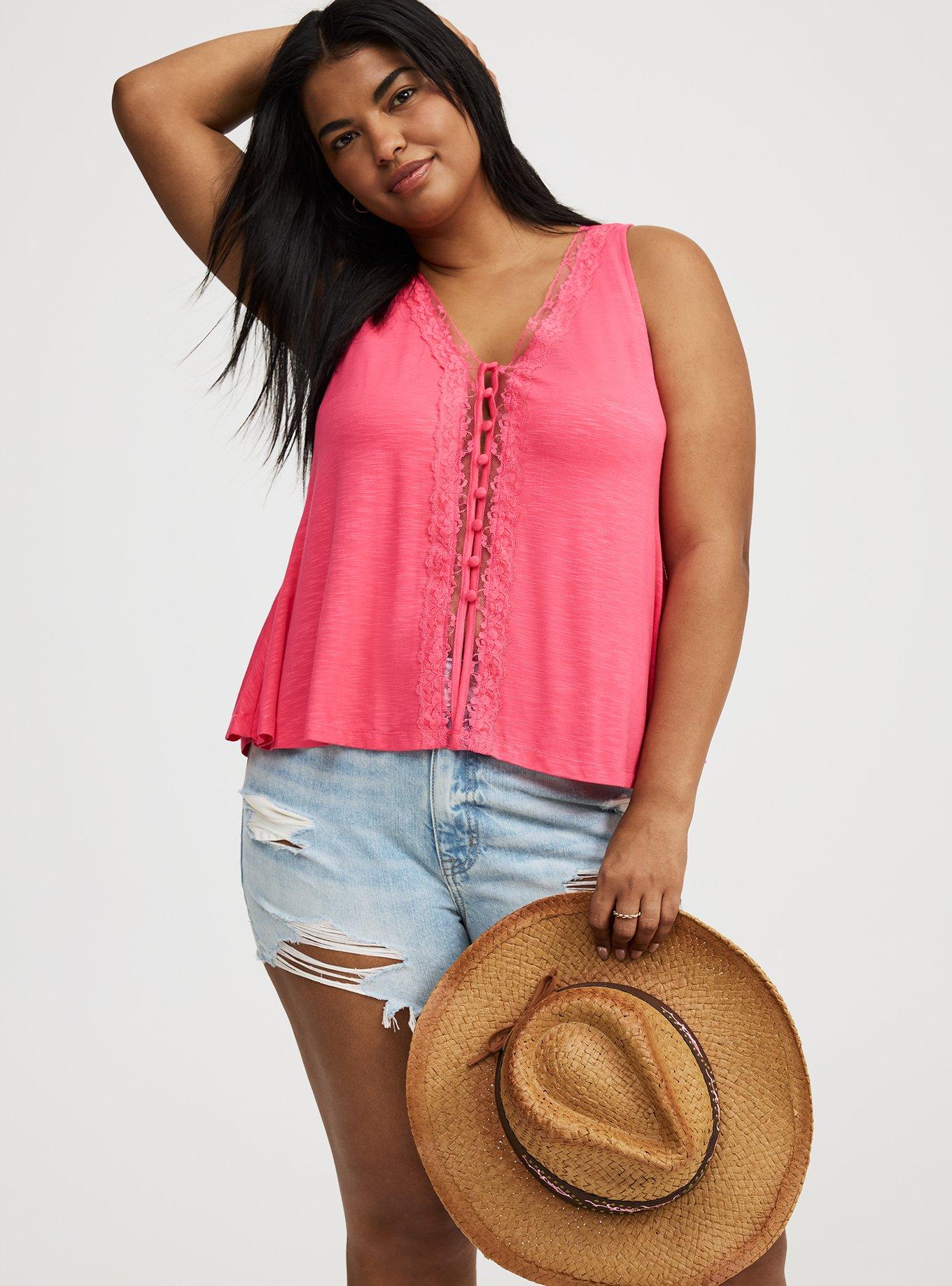 FIT Measures 27'' from shoulder (size 2). MATERIALS + CARE Super Soft Slub knit fabric: An incredibly soft, versatile knit with a slub texture that hugs close to the body. Stretch level: Maximum. 57% cotton, 38% rayon, 5% spandex. Machine wash cold. Line dry. Imported. DETAILS V-shaped neckline. Sleeveless. Button front. Lace detail. Fit & flare silhouette.