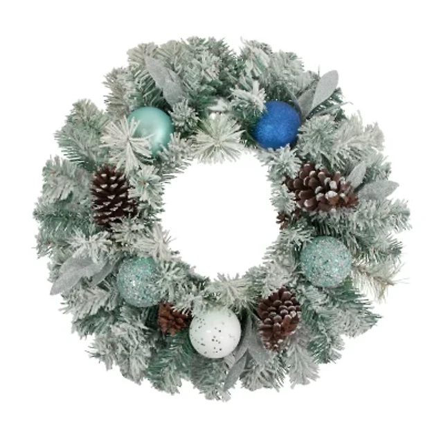 Flocked Pine with Blue and Silver Ornaments Artificial Christmas Wreath 24-Inch Unlit