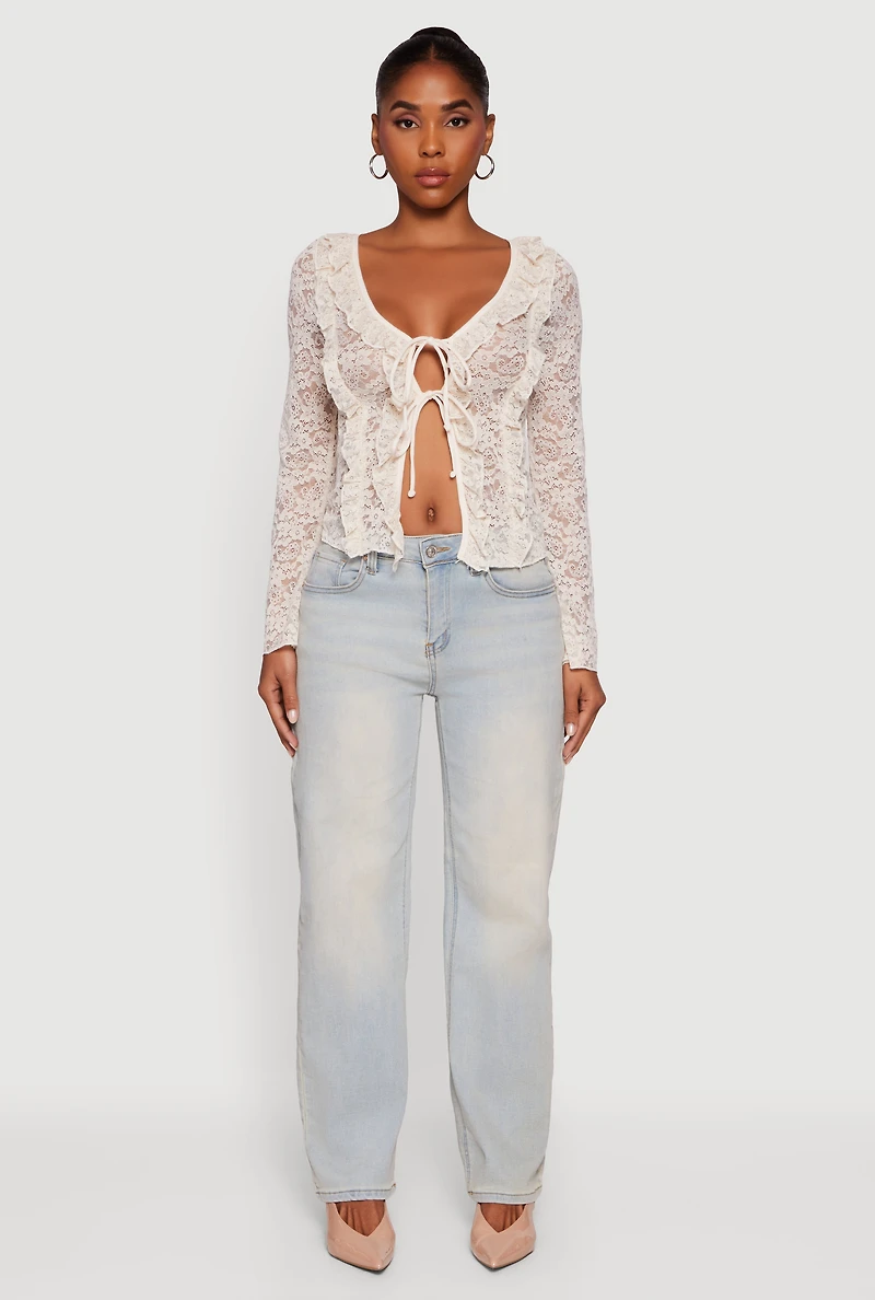 Step into your next night out or festival with the Floral Lace Double Tie Front Ruffle Top. This classic fit blouse brings together delicate floral lace and playful ruffles for a look that’s effortlessly feminine and totally on-trend. The scoop neckline and bell sleeves add a flirty vibe, while the double tie front lets you customize your style with a chic twist. Lightweight and breathable, it’s perfect for dancing the night away or making a statement wherever you go. Timeless classic fit for comfortable, flattering wear Elegant floral lace fabric with romantic ruffle details Double tie front design adds a fun, adjustable flair Scoop neckline and bell sleeves for a trendy, feminine touch Ideal for nights out and festival vibes Model Pictured Wearing Size S Height 5 ft 8 in, Bust 32 in, Waist 25 in, Hips 36 in Fits True To Size Content and Care Material: 90% Polyester, 10% Spandex Care Instructions: Machine Wash, Tumble Dry Country Of Origin: China Rainbow Item Number 3402077133366 NATURAL - 3402077133366012