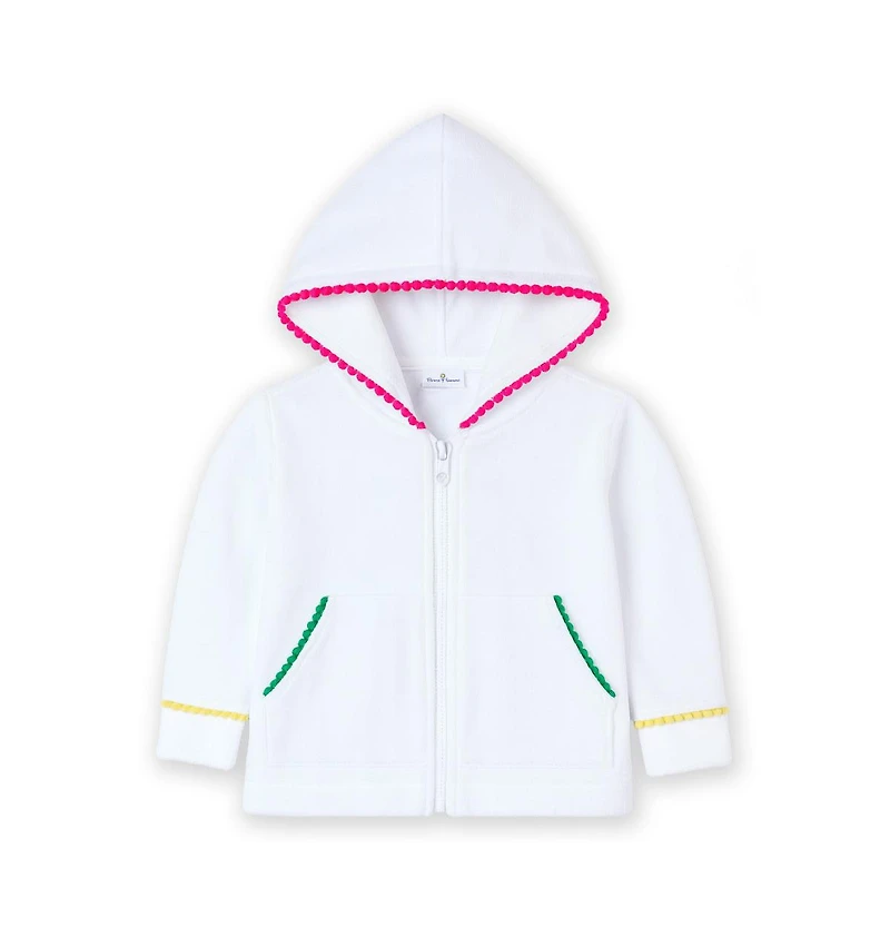 Soft and cozy with a pop of color, this hoodie is crafted from white terry cloth in a comfortable cotton-blend—perfect for layering after a swim or during breezy vacation evenings. Cheerful yellow, pink, and green pom poms add playful charm, while a front zipper makes it easy to slip on and off.Lightweight yet cozy, it s an ideal warm-weather layer for poolside lounging, beach days, and carefree adventures under the sun.