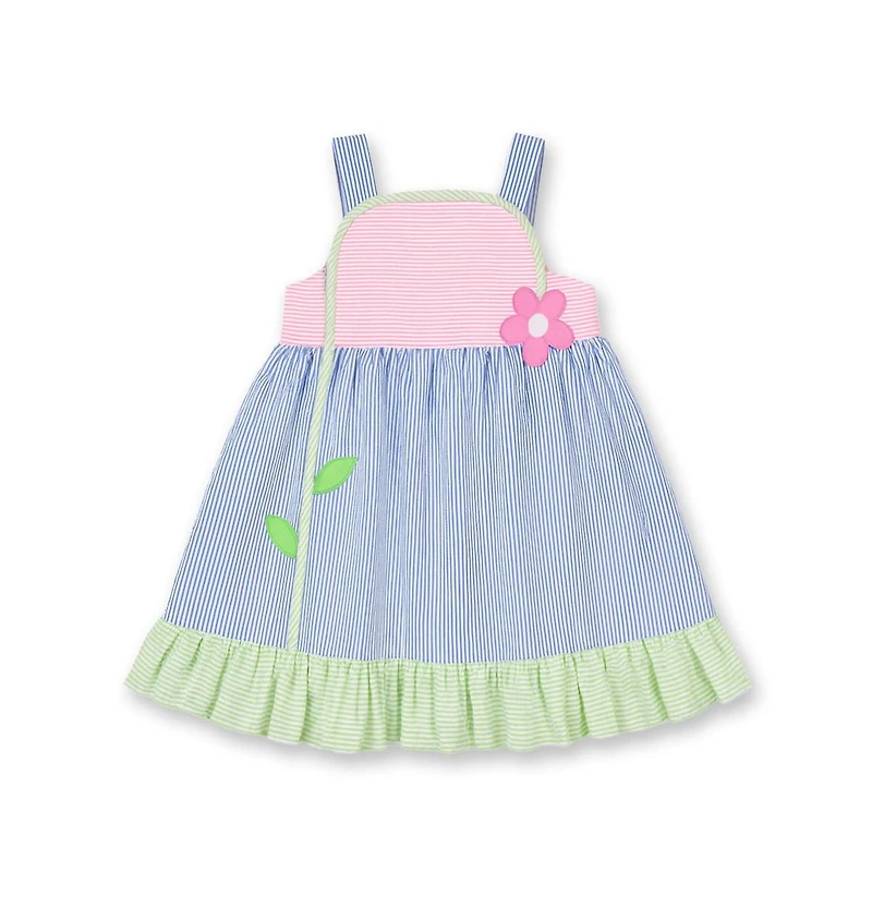 Bold, colorful, and made for sunshine, this vintage-inspired dress is crafted from bright pink, royal, and lime stripe seersucker for a lightweight, breezy feel perfect for warm-weather getaways. A cheerful bright pink applique flower pops against lime stripe binding, adding playful contrast and standout charm.Designed with adjustable shoulder straps featuring two-button settings, the waist dress silhouette offers a comfortable, customizable fit. A softly shirred skirt with a hem ruffle adds movement and flair, while a back invisible zipper keeps dressing easy. Falling to the knee, it s ideal for vacation days, resort dinners, and picture-perfect moments in the sun.
