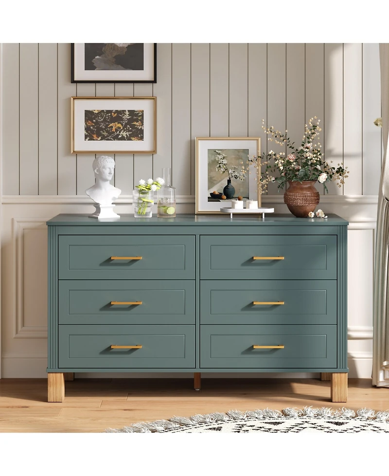 Green 6 drawer double dresser with modern mid century style, solid wood legs and metal handles. Features spacious drawers high weight capacity smooth slides and sturdy construction ideal for bedroom kids room and living area.
