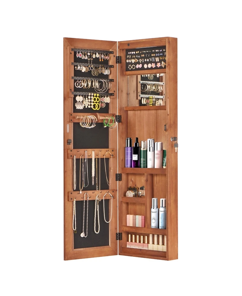 This solid wood jewelry armoire features a full-length mirror, auto Led lighting, lockable design with 2 keys, and large capacity storage. It can be wall or door mounted to save space, with multiple compartments for rings, bracelets, necklaces and earrings. Overall size 47.5"H x14.3"W x4"D.