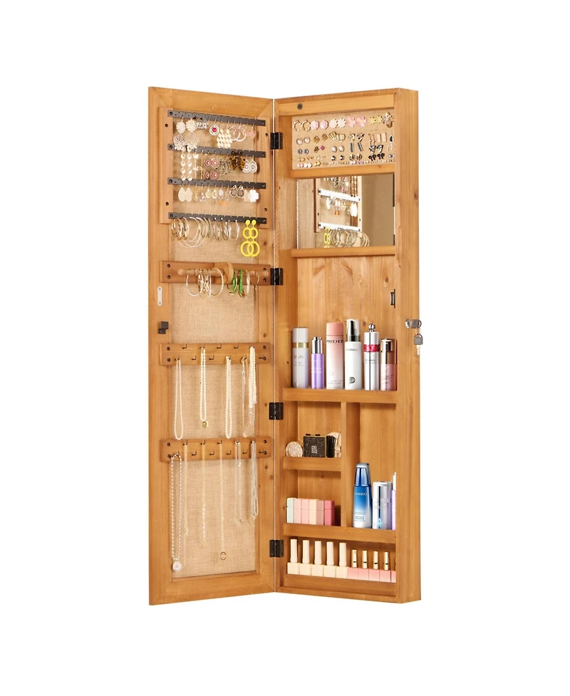 This solid wood jewelry armoire comes with full length mirror auto Led lighting and lockable design with two keys It offers large capacity storage and can be wall mounted or door hung to save space for your daily use