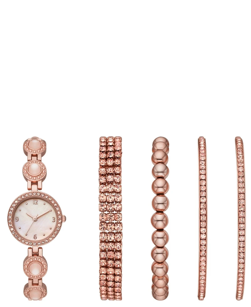 This Folio women's gift set includes a 26mm rose gold-tone watch with pink beads and glitz accents, three-hand pink pearl texture dial, and four rose gold and glitz bracelet accessories. Style #FMDMC128