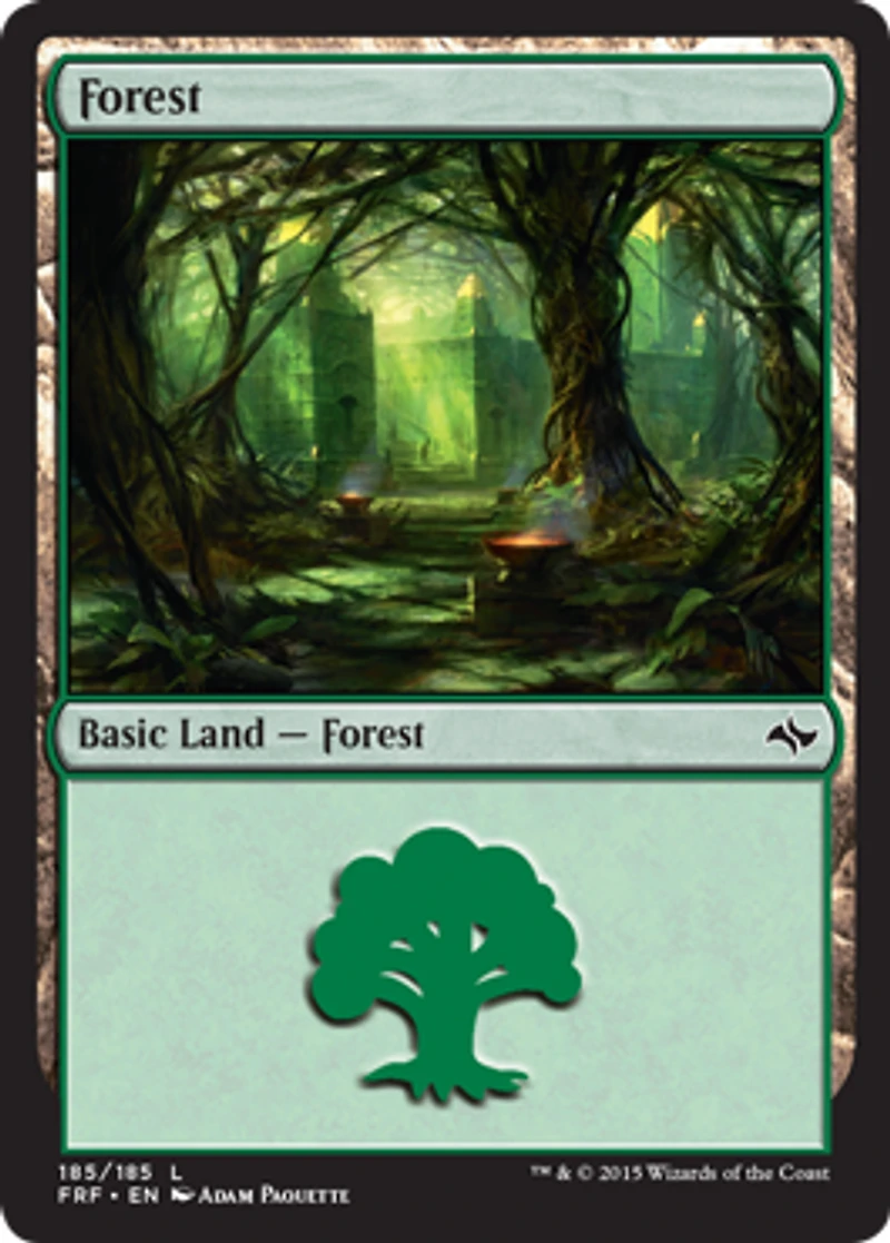 Color: Land Card Text: G Rarity: L Card Type: Basic Land - Forest Artist: Adam Paquette Name: Forest Finish: Foil Card Number: 185/185 Set Name: Fate Reforged
