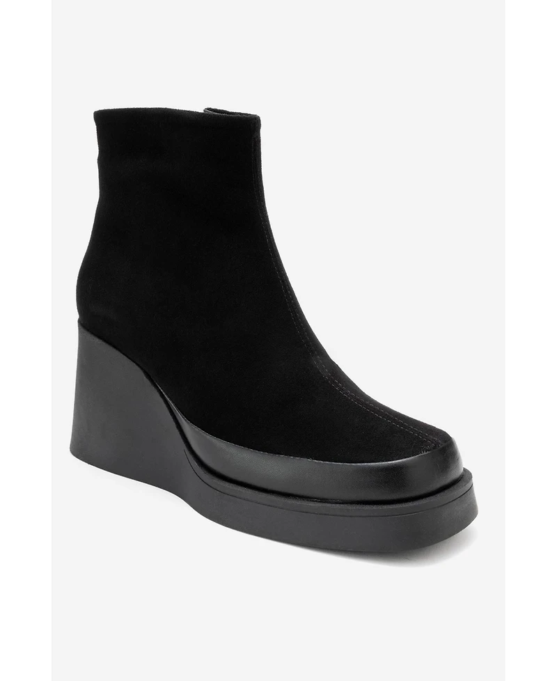 A refined ankle boot that fuses soft suede texture with a sculpted wedge platform for elevated everyday elegance
