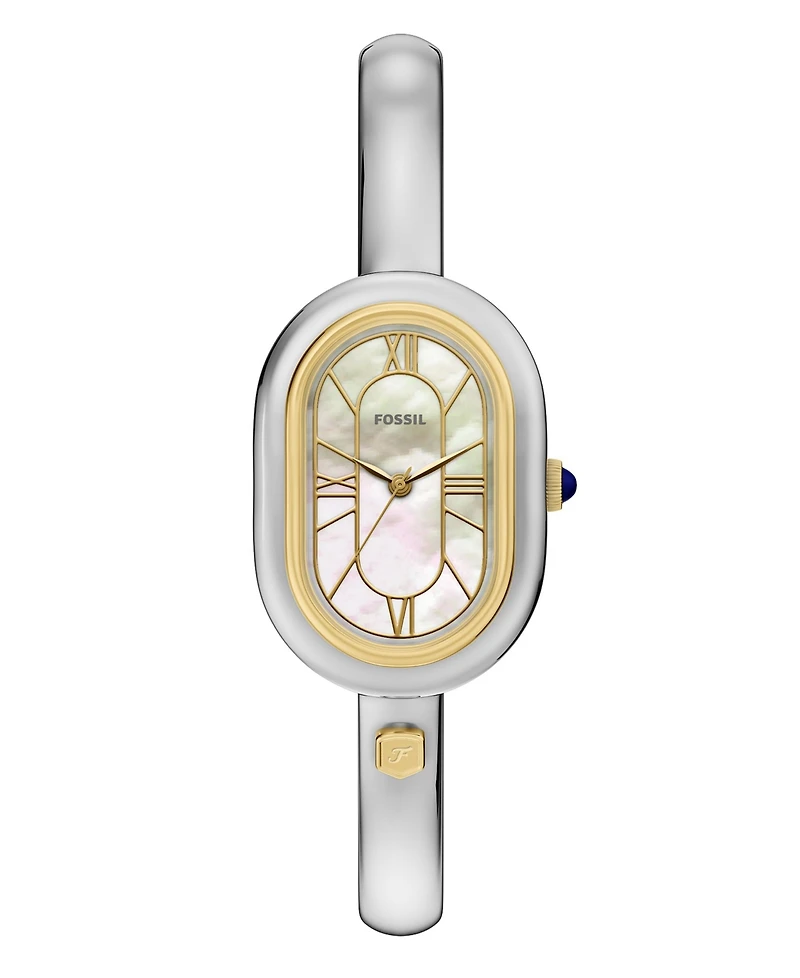 The two-tone stainless steel jewelry-inspired bangle pairs seamlessly with the oval case to create a sleek bangle watch. The white mother-of-pearl dial is accented with gold-tone hands and indices. The bangle bracelet features a convenient push-button closure, allowing for easy wear and removal.
