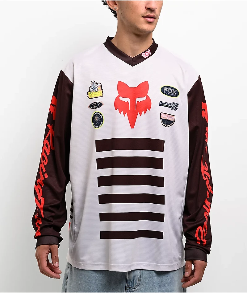 Fox Racing introduces the Super Trick 180 cream long sleeve jersey with a warm cream body and deep brown sleeves for a vintage-inspired moto look. Sublimated Fox logos sit across the chest, while matching script branding runs down the sleeves for add