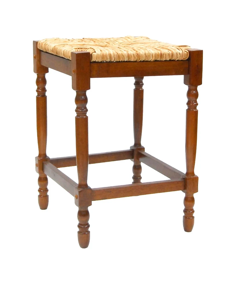 Here is a contemporary styled counter stool designed with comfort in mind. It has a woven rush seat, geometric accents, and lathe turned box stretchers. This stool is offered in four color choices Antique Black, Antique White, Walnut or Chestnut