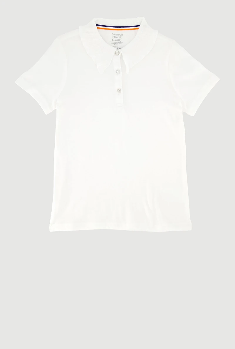 Make back-to-school style sparkle with the French Toast Girls 4-6x Rhinestone Button Polo Shirt. This short sleeve polo shirt combines classic school uniform vibes with a touch of glam thanks to its rhinestone buttons. The picot rib knit collar and stripe neck taping add subtle details that keep the look fresh and fun. Perfect for girls who want to shine in comfort and style every school day.