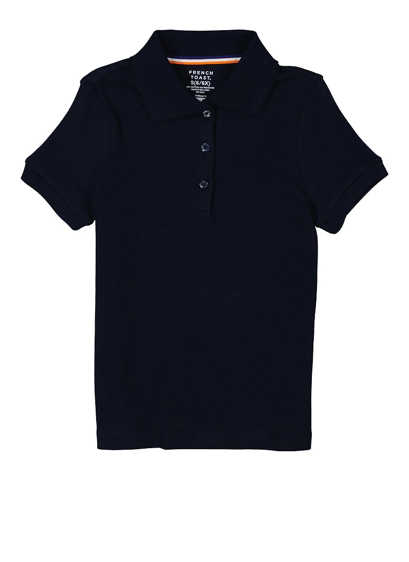 Discover the perfect blend of style and comfort with the French Toast Girls 4-6x Short Sleeve Picot Trim Polo Shirt. Designed for everyday school days, this classic polo adds a touch of polished charm to her wardrobe. The soft fabric, combined with the cute picot flat collar and rib cuffs, makes it easy for her to look sharp and feel confident. Whether she's in class or hanging out with friends, this versatile top is a must-have for her school uniform collection.