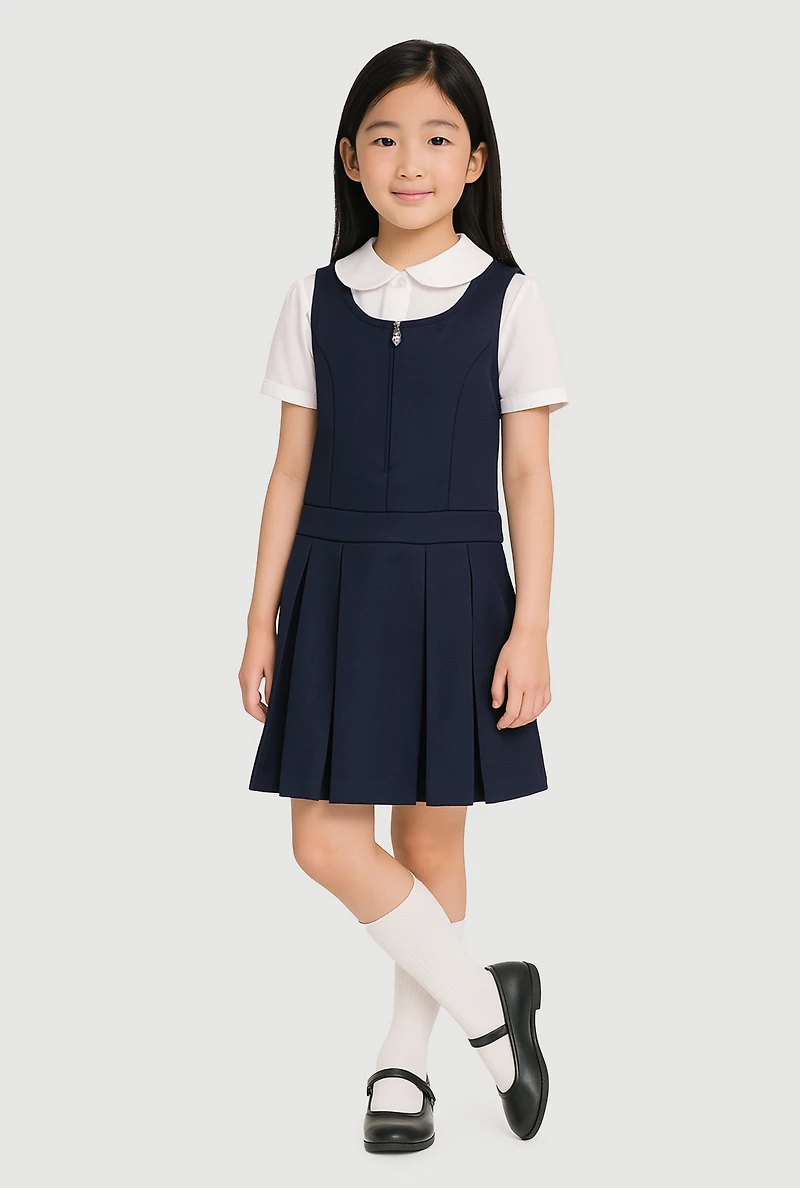 Get your little scholar ready for the school day with the French Toast Girls 7-14 Zip Front Pleated Jumper. This mid-length, sleeveless jumper features a classic scoop neck and neat pleats that add a touch of timeless style. Designed for easy wear with a front zipper, it combines comfort and convenience so she can focus on what really matters—learning and having fun. Perfect for back to school, this solid-colored jumper is a wardrobe staple that brings effortless charm to every school day outfit.