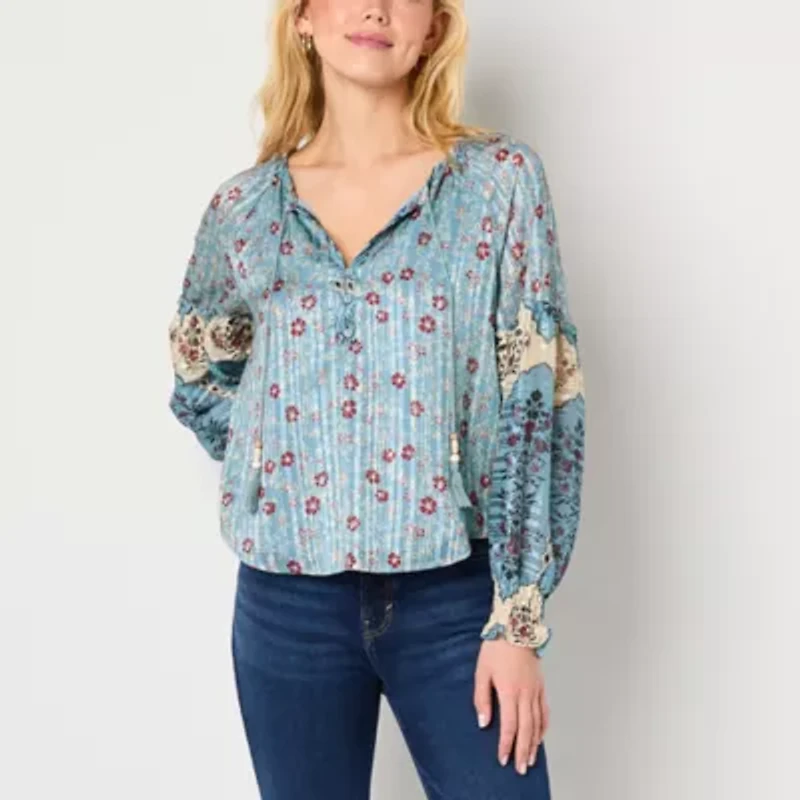 This Frye and Co. women's split tie neck blouse is a beautiful boho inspired style that you can dress up or down. Made from a metallic lurex multicolor printed fabric, this pullover breezy top has a split tie neck and long puffed sleeves. Wear it with slim-fit pants or jeans.