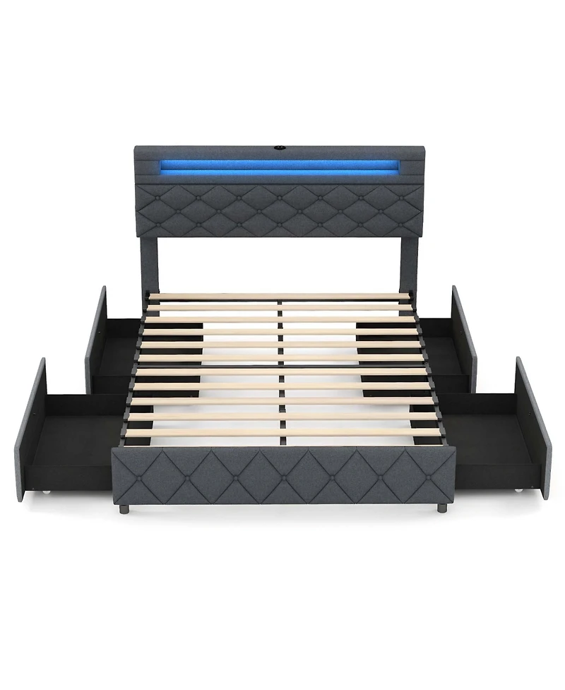 Full Size Bed Frame with Led Lights & Charging Station & Modern Upholstered Bed
