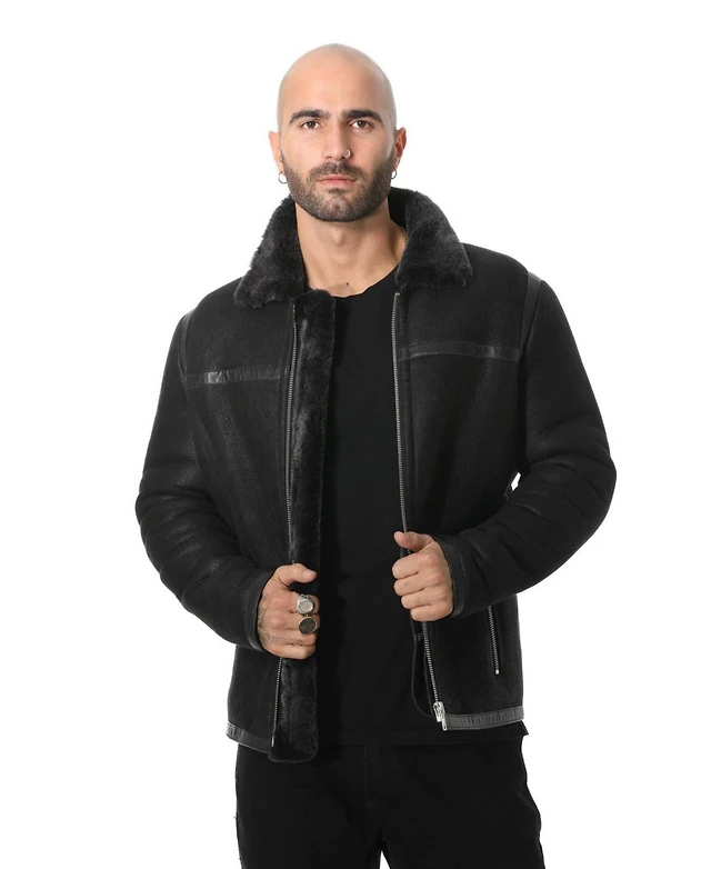 Furniq Uk Men's Leather Shearling Jacket, Black
