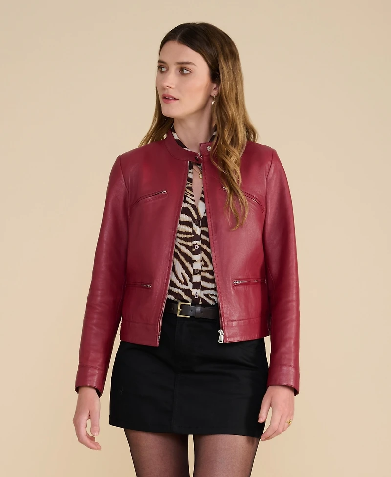 Crafted from 100% British leather, the Leather Jacket in Light Burgundy is a refined essential designed to add depth and modern edge to your wardrobe. The rich light burgundy tone enhances the smooth, supple finish of the leather, offering a statement colour that remains effortlessly wearable.Cut in a clean, streamlined silhouette, features a minimalist stand collar with press-stud fastening and a sleek zip-front closure. Subtle zip pockets at the chest and waist introduce understated hardware detailing, while the tailored fit creates a flattering, feminine shape. The cropped length makes it perfect for pairing with high-waisted tailoring, denim or mini skirts for a polished day-to-evening transition.Timeless yet contemporary, delivers confident styling with a sophisticated finish.