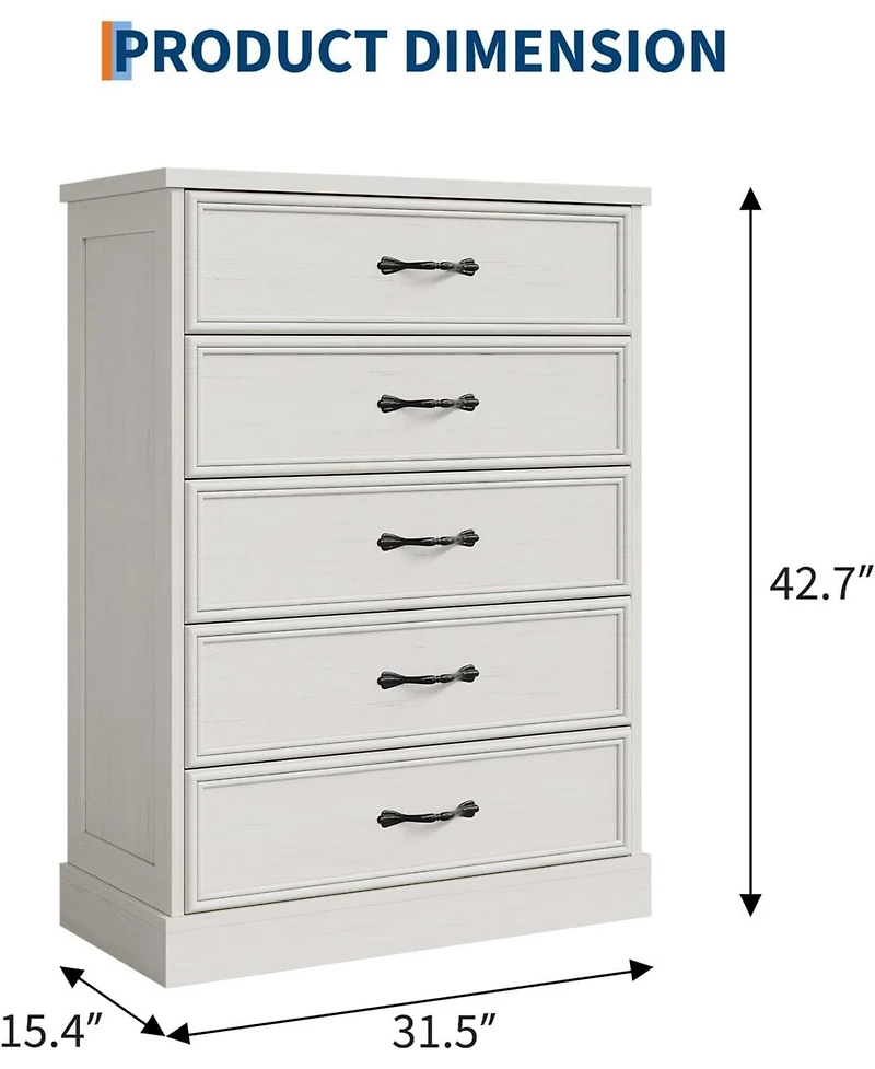 Ample Storage Space – Designed with five spacious drawers and a generous tabletop, this dresser offers abundant room to organize clothing, accessories, books, decor, and more—helping keep your home neat and clutter-free. Each drawer features smooth-glide hardware, allowing easy opening and closing even when fully loaded